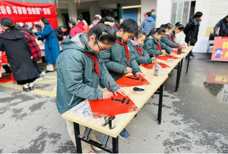 在活动当天,华阳中心小学的师生们早早地来到建新社区小广场,准备为社区居民写春联。学校老师仔细地指导学生们的书写技巧,确保每一笔、每一划都能书写准确到位,传达出美好的祝福。