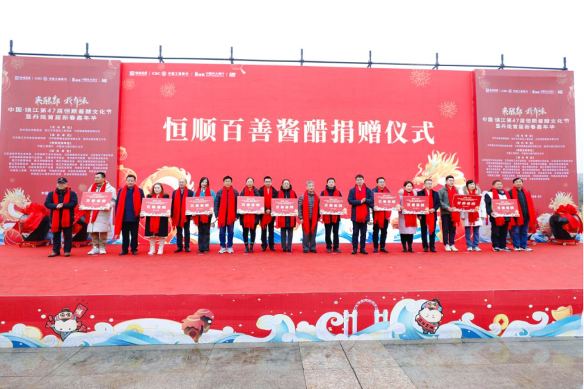 “不打酱油不过年,打了酱油过好年”。开幕式现场举行了“恒顺百善酱醋”捐赠仪式,今年,恒顺集团联合中国工商银行镇江分行、中国建设银行镇江分行、镇江丁岗镇人民政府、镇江来伊份食品有限公司等爱心企业、爱心单位,为镇江社会儿女服务社、镇江市福利院、镇江九久老年康复中心、信缘康米山颐养院等十家养老中心和困难家庭捐助近十万元的“百善酱醋”。