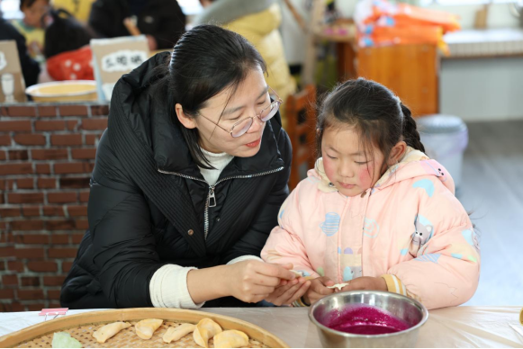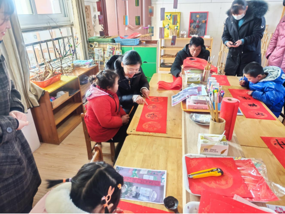 活动现场,为了让孩子们更好地感知中国传统文化魅力,提高动手操作能力,在老师和党员志愿者的带领下,开展了“剪窗花、写对联”“包饺子、吃饺子”等特色手工活动。“老师你看,我给这个窗花剪了好多小的三角形,你看好看吗?”“我要包一个馅儿最多的饺子!”“快看!我包了一个小的饺子!”在一片欢声笑语中,一张小小的彩纸在孩子们的手中变幻出各种漂亮的造型、一个个形态各异的饺子在孩子们的手中诞生了……