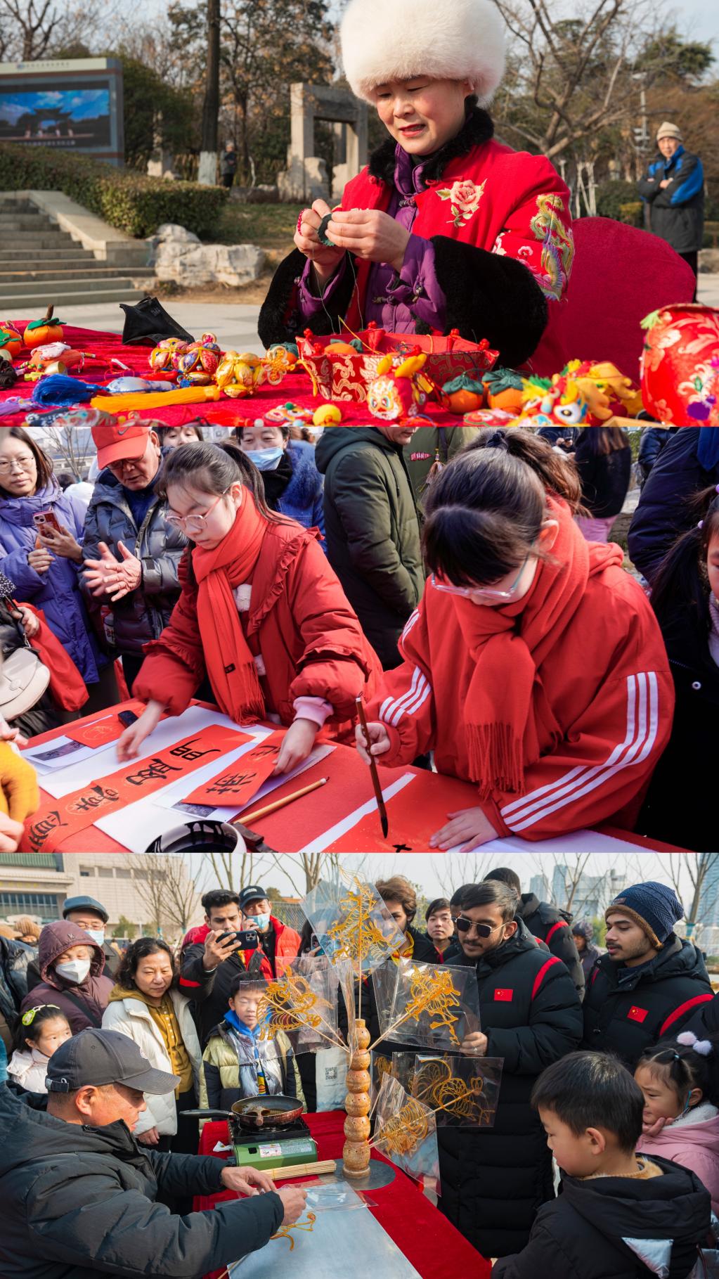 现场还布置了非遗展示区,工艺精巧的香包、喜庆美观的绳结,栩栩如生的糖画、制作精良的版画吸引了众多市民驻足欣赏,感受独特的“民俗年味大餐”。徐州市风化街中心小学的“小小书法家”们也挥毫泼墨,写春联、送祝福,一笔一划书写新年寄语,喜气洋洋迎接龙年新春。