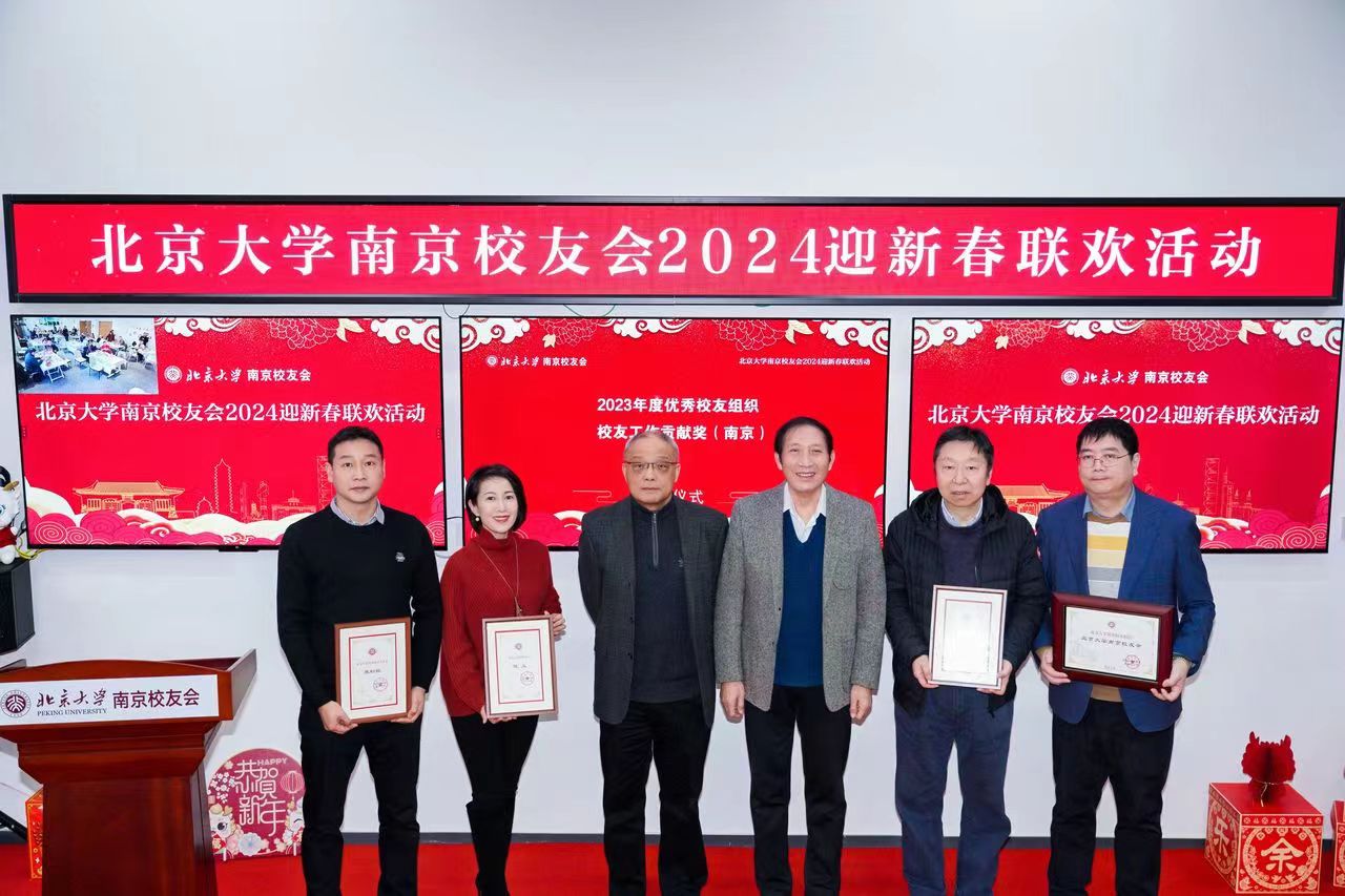 现场还进行了颁奖仪式。据悉,北京大学南京校友会自成立以来,团结南京校友,发扬母校优良传统和良好学风,探索和开展了一系列工作,凭其卓越工作荣获2023年度“北京大学优秀校友组织”,多名校友和工作者也获个人荣誉。桂爱平荣获“北京大学校友工作贡献奖”,北京大学南京校友会顾问陈义荣获“北京大学优秀校友”,北京大学南京校友会执行秘书长张松毅荣获“北京大学优秀校友工作者”,张国有、朱锋上台颁奖,共同见证荣耀时刻。