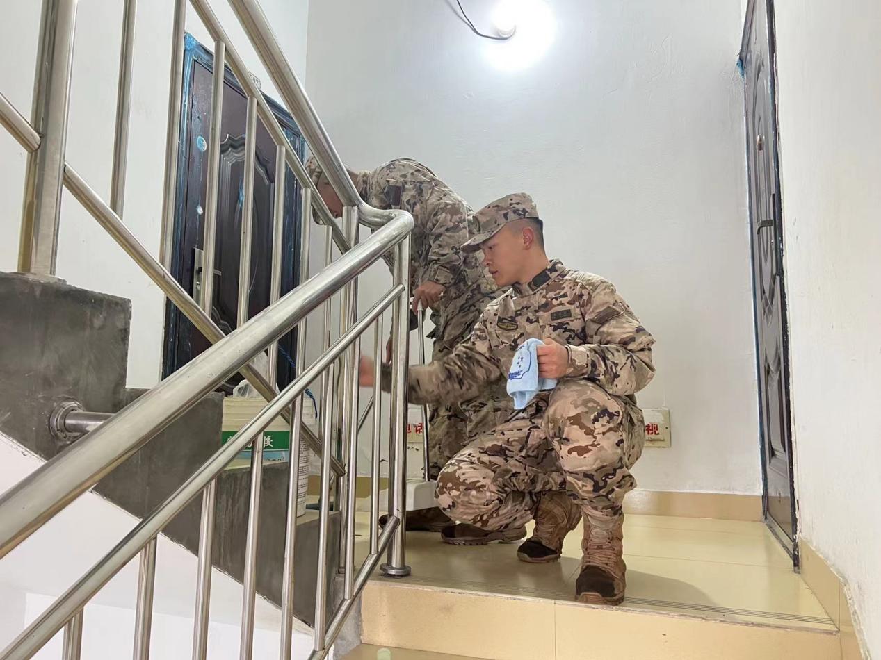 活动中,部分武警官兵跟随社区党员干部、工作人员走进空港新苑小区,拿着抹布、扫帚和簸箕等清扫工具,两三人一组,分别进入各楼栋清扫楼道卫生。
