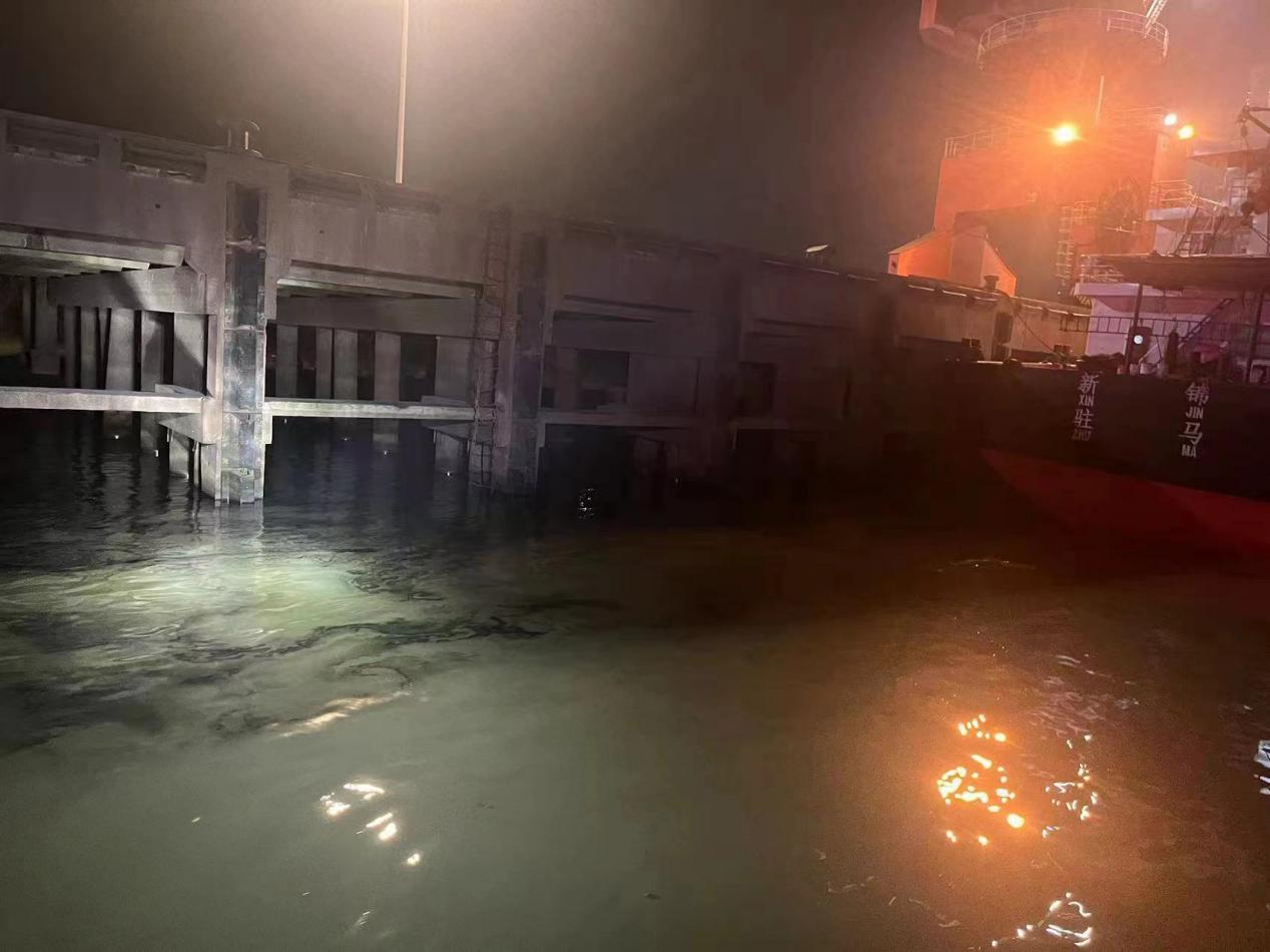 污染水域下游仅5公里处即是江宁滨江水厂取水口,若油类污染物一旦进入水源保护区,将危及南京市两百多万群众的饮水安全。执法人员根据现场情况,果断协调辖区码头工作人员和防污染物资开展应急处置工作。晚上8时许,在滨江饮用水水源保护地上游完成第一道围油栏布设,为取水口建立了一道安全屏障。随后,经南京市水上搜救中心统一调度指挥,征调工程船“宁航工XX”轮等应急处置力量,在滨江水厂取水口上游约1300米处增设第二道围油栏,海宏码头工作人员使用吸油毡对江面油污进行清理。晚上9时许,第二道围油栏布设到位,有效遏制了油污在长江大面积扩散。当晚11时许,江面油污被有效清除,经生态环境部门检测,水质正常。