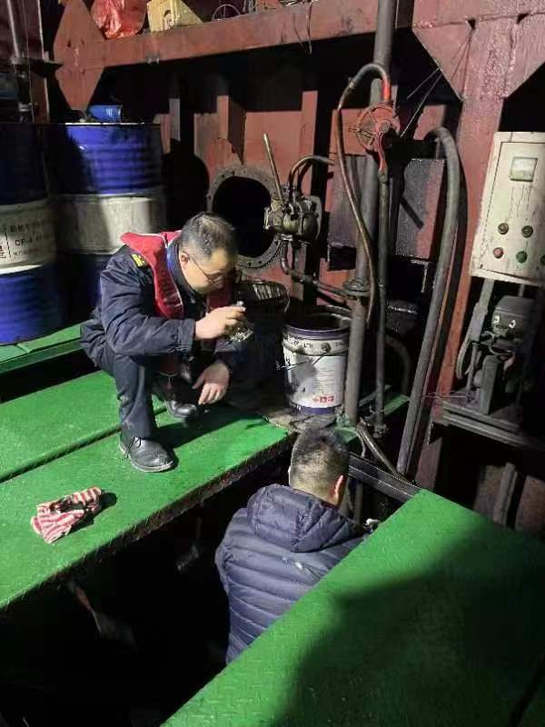 南京海事局执法人员在开展应急处置和污染水域范围监测的同时,同步进行污染物溯源排查。执法人员根据污染水域特征,将排查范围缩小海宏码头靠泊船“新*江”轮。经登轮检查,勘验船舶机舱和船壳,发现该轮尾轴处舱底含油污水有处理痕迹,左舷艉部冷却水排放口至江面船体有条状黑色油污痕迹残留,艉部船壳附着黑色油污。面对勘验结果,该轮船长承认当日下午1650时至1800时通过潜水泵向江面偷偷排放约2个立方机舱舱底水的违法事实。