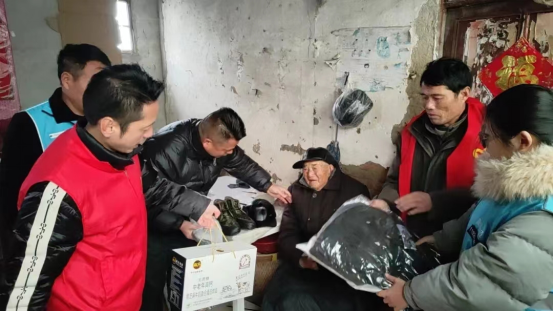 在百岁老人家中,志愿者们与百岁老人及家属亲切交谈,仔细询问了解他们的生活起居及健康情况,并提醒近期天气变化大,注意添衣保暖。走访过程中,他们还观察其房屋情况,确保其居家安全,守护他们的健康。活动尾声,志愿者为百岁老人送上牛奶、衣物等慰问品,以及诚挚的节日祝福。