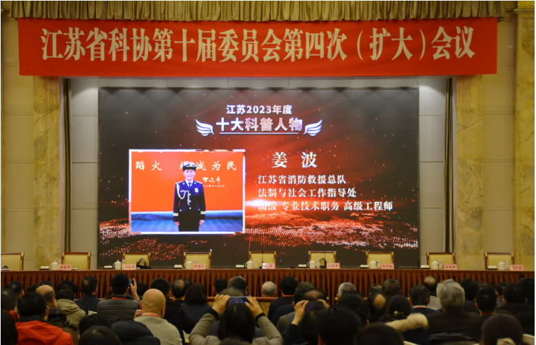 近日,江苏省科协第十届委员会第四次(扩大)会议在南京召开。会议全面贯彻落实党的二十大精神,学习贯彻中国科协十届八次全委会精神,认真落实省委十四届五次全会部署,总结回顾全省科协系统2023年工作情况,研究部署2024年重点工作,团结引领全省各级科协组织和广大科技工作者,切实履行“四服务”工作职能,为奋力谱写“强富美高”新江苏现代化建设新篇章贡献科协力量。省委常委、省委宣传部部长张爱军出席会议并讲话。中科院院士、省科协主席陈骏代表第十届常委会作2023年工作报告。省委副秘书长仲红岩出席会议。会议由省科协党组书记、副主席过利平主持。江苏省消防协会会长蒋正林、秘书长李前林参加会议。会议表彰了江苏省年度行业领域十大科技进展,江苏省2023年度十大科普人物、十大科普集体、十大科普成果。其中,江苏省消防协会推荐的江苏省消防救援总队专业技术高级指挥长姜波同志获评“年度十大科普人物”并上台领奖。