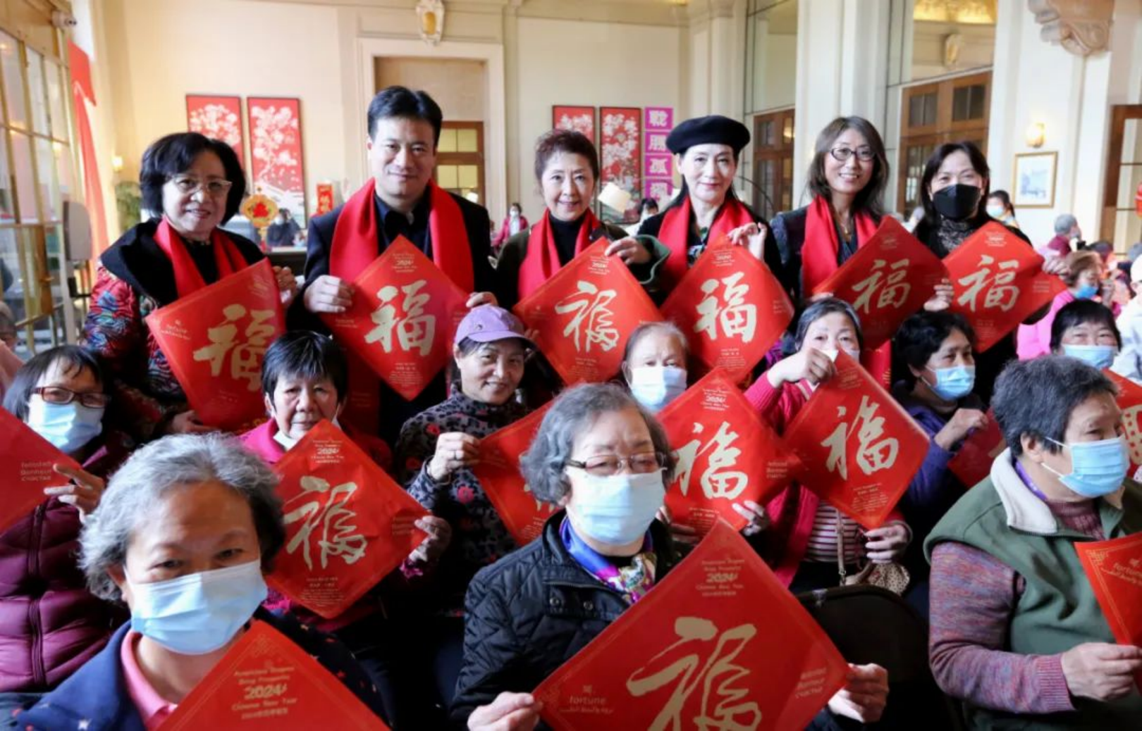 旧金山时间2月6日,喜迎中国龙年之际,“祥龙献瑞-中外艺术家海外送福迎春活动”走进奥克兰健康中心,为200余位老人送上中国新春的祝福。江苏省海外联谊会文化艺术专业委员会副主任、江苏省中国画学会副会长兼秘书长翟优,美国国际传统文化发展基金会主席、美国北加州苏浙同乡会会长翟椿萍,北加州苏浙同乡会常务副会长李一冰,北加州苏浙同乡会理事南湾分会副会长龚建华,北加州苏浙同乡会理事王柏青,全美苏浙同乡总会(总商会)拉斯维加斯分会会长徐兰英等参加了此次活动。