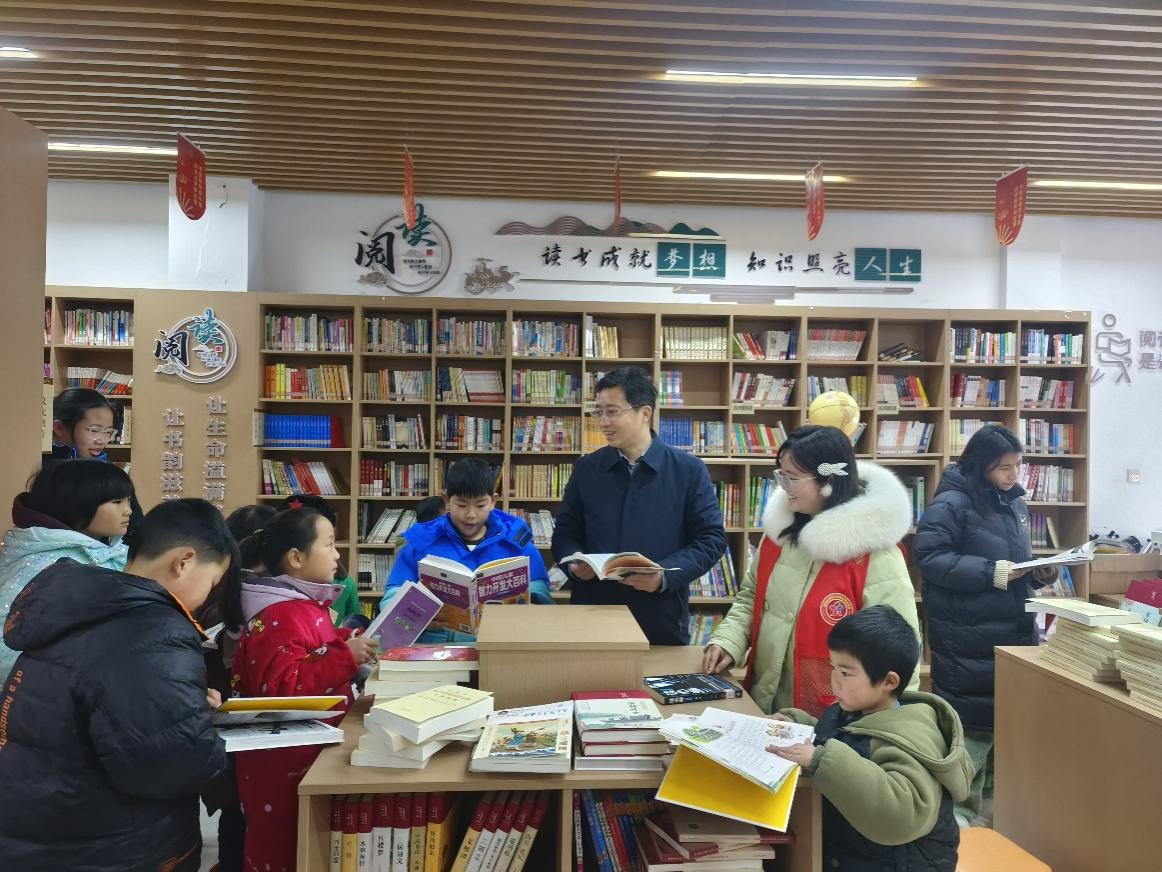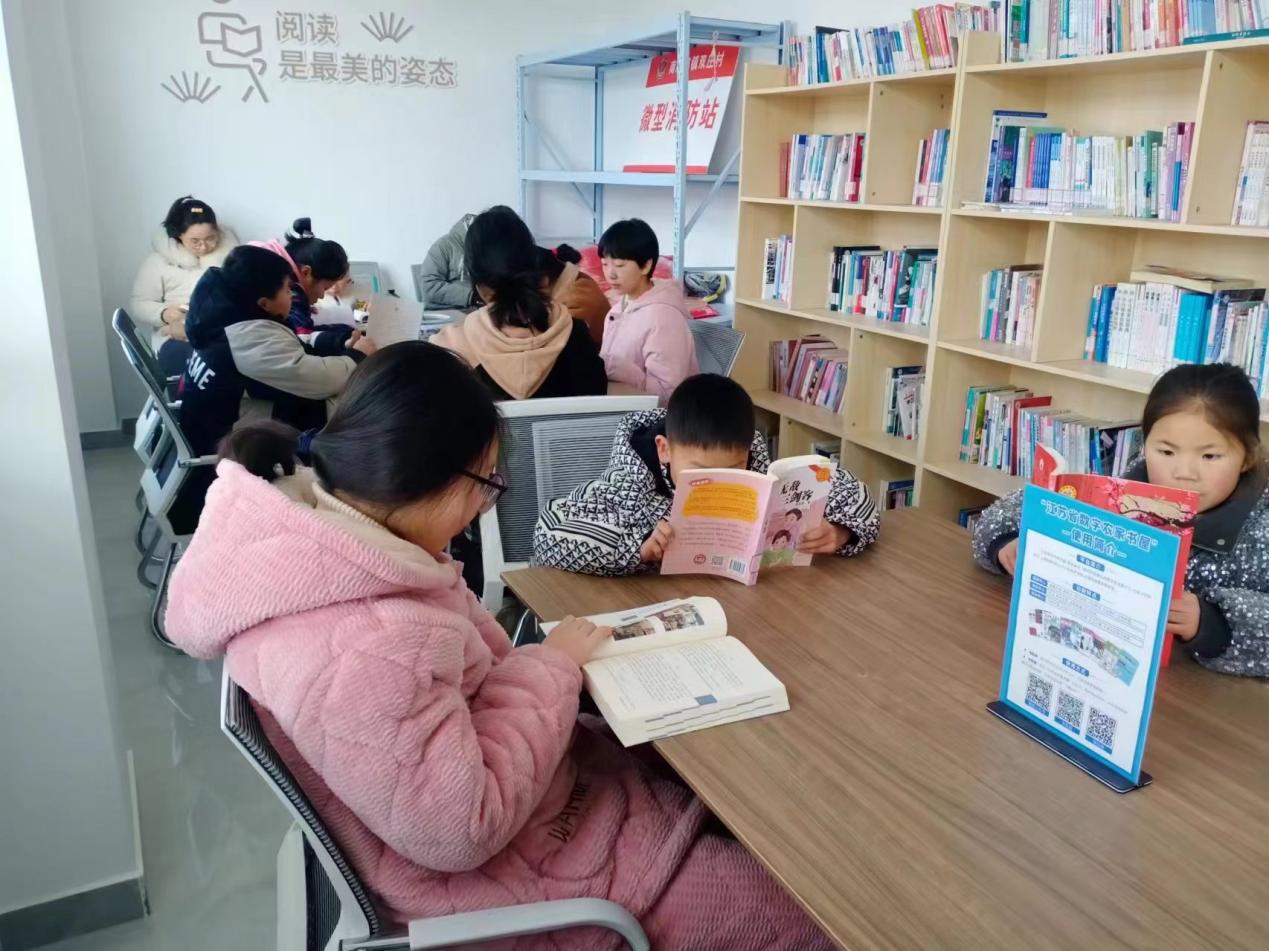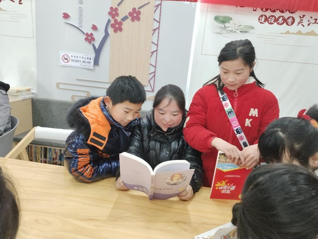 2月9日,淮安书香淮阴区渔沟镇服务点志愿者小姐姐正和小读者们一起阅读。