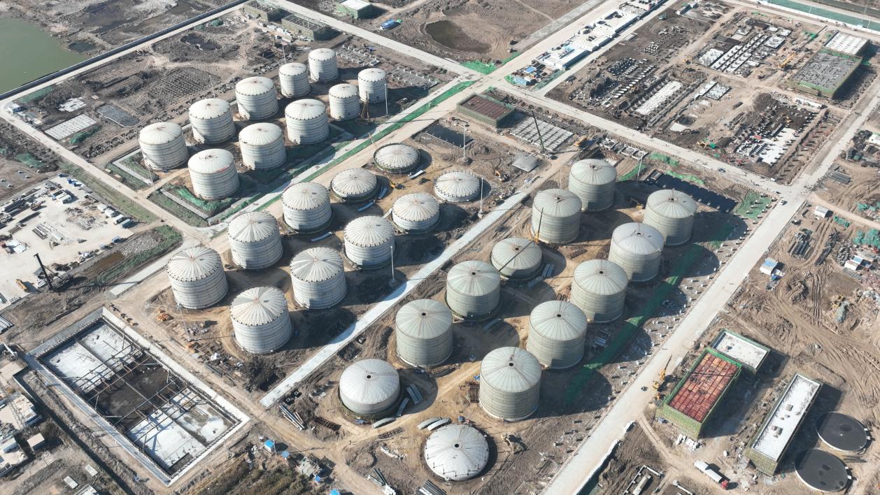 “为确保项目如期建成投产,春节期间我们参建各方施工及管理人员300余人坚守岗位,抓建设、抢进度。目前,现场桩基、全厂性固化、32台储罐主体等全部完成;22条场内道路已完成基层施工,面层完成11条;37个单体建筑物已封顶23个;全场设备共计1176台,目前安装完成31台……”项目经理何健说。