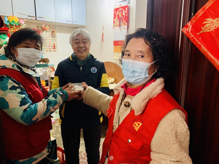 新门口社区馨服务队队员、紫竹林社区的侨联志愿者和网格员分组冒雪走访辖区独居老人。详细了解老人的身体健康、生活情况和饮食起居,并叮嘱老人,寒潮再次来袭,要预防流感,保重身体。随后将寄托浓浓“爱心”的汤圆送到他们的手上,祝福他们度过一个安定团圆的元宵佳节。