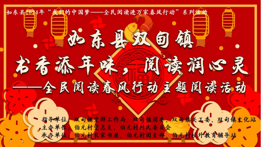 为推动全民阅读提质增效,让孩子们过一个有文化、有内涵的“书香年”,近日,如东县双甸镇在伯元村农家书屋开展了“书香添年味,阅读润心灵”全民阅读春风行动主题阅读分享活动,拉开了2024年双甸镇全民阅读进万家春风行动的序幕。参加本次活动的有伯元村中小学生及部分家长、大学生志愿者、“五老”代表、一米阳光服务小分队的全体同志。