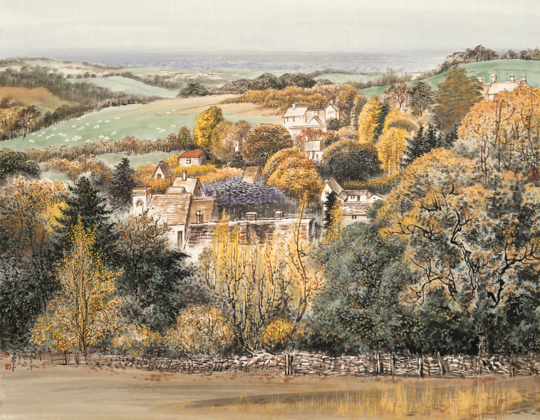 萧平创作的《荷花团扇系列》《绘者》《英格兰乡镇》《鸣沙山下驼铃声》《火焰山下花蝴蝶》《泸沽湖即景》《云涌山野》《瓶中之向日葵》等,尽收国内外山川美景,让人们感受到生活的美好。