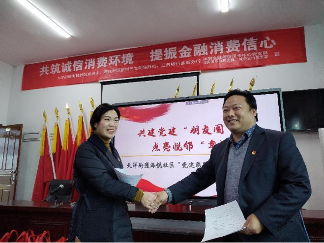 入驻“党建联盟”,争做“为民先锋”。活动中,江苏银行城中支行、海悦社区党总支商议并签订“悦邻幸福圈”合作共建协议。今后,双方将聚焦“我为群众办实事”,通过党员交流互动、党建载体互用、结对帮扶互助等方式,夯实党组织战斗堡垒,不断提升为民服务效能。(董志梅)