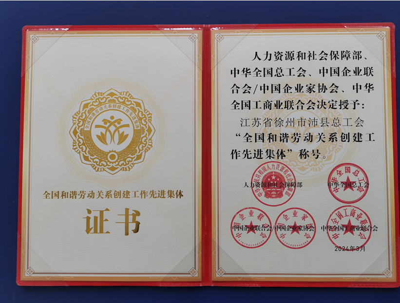 3月19日,第一届全国和谐劳动关系创建工作先进集体和先进个人表彰暨经验交流会在北京召开。会议表彰了100个全国和谐劳动关系创建工作先进集体和299名先进个人,沛县总工会受邀参会并被授予“第一届全国和谐劳动关系创建工作先进集体”称号,这也是江苏省唯一获此殊荣的县级总工会。
