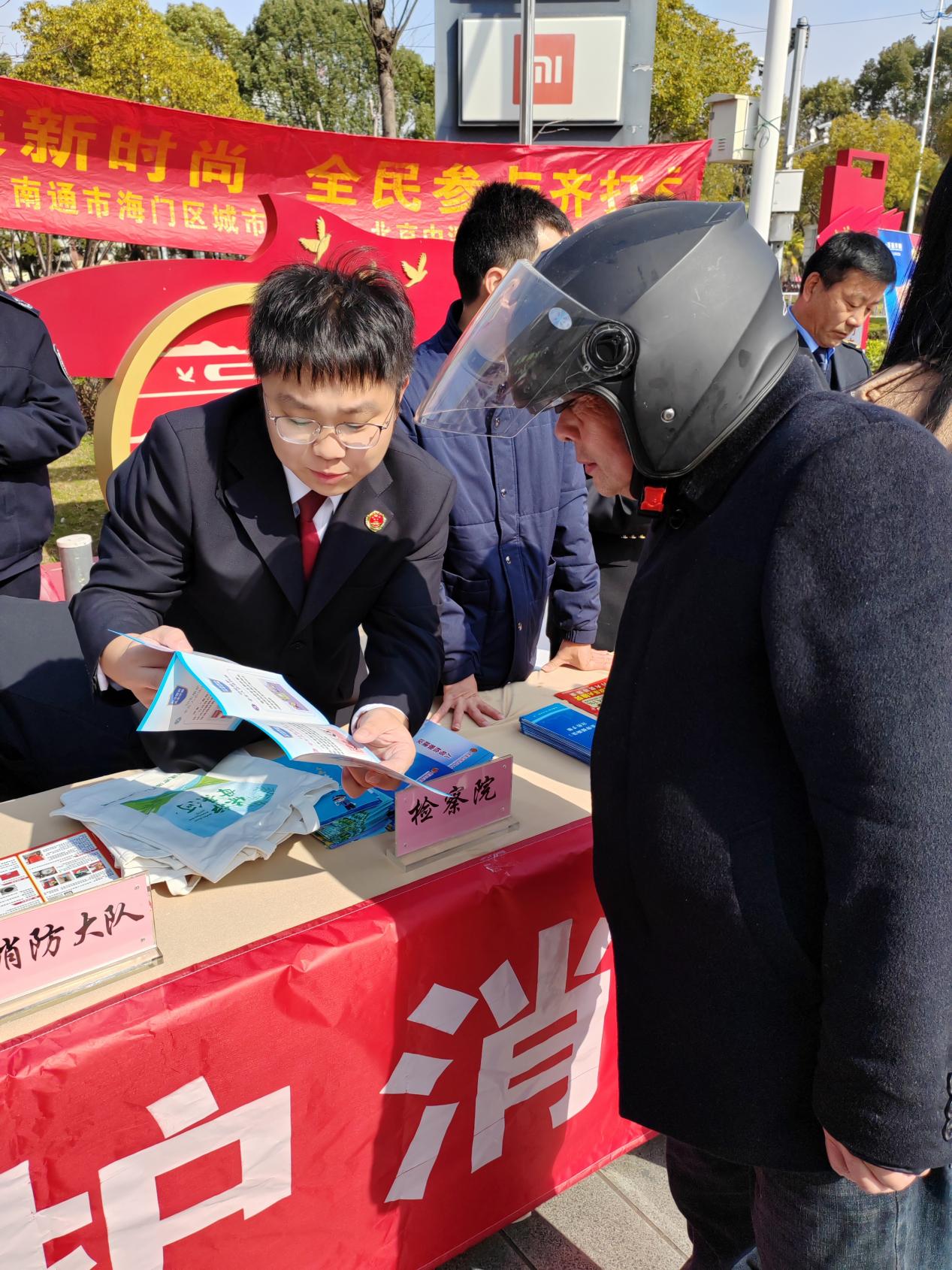 为切实保护消费者权益,营造放心舒心消费环境,3月15日,海门区检察院与区市场监督管理局、区司法局、区商务局等17家单位在海门区龙信广场前举行3·15国际消费者权益日大型咨询服务活动,现场为群众答疑解惑,宣传消费维权政策法规。