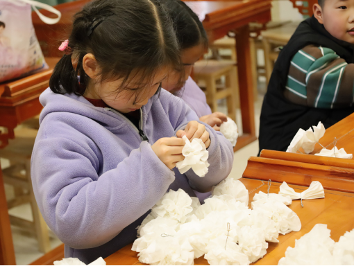 值得一提的是,此次祭扫烈士活动所使用的400余朵小白花,全部由学校衍纸社团一年级学生们亲手制作的。在制作纸花的过程中,同学们克服了年龄小、手法不熟练,导致纸张撕裂或形状走样的难题,在老师地鼓励和同伴地互助下,他们一次次尝试,一次次调整,把对英烈无限崇尚之情化作了绽放在手心里的朵朵白花。