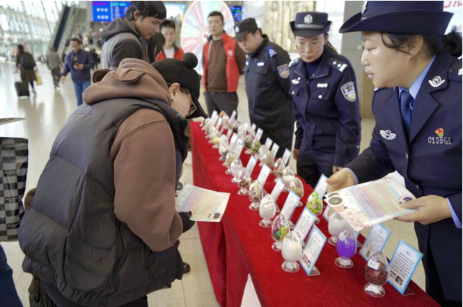 玄武公安分局禁毒大队与南京铁路公安处南京站派出所民警,禁毒志愿者结合毒品模型一起向过往旅客生动详细讲解毒品种类、特征及毒品对身心健康的危害,同时通过互动知识竞答小游戏加深旅客对禁毒知识的了解。