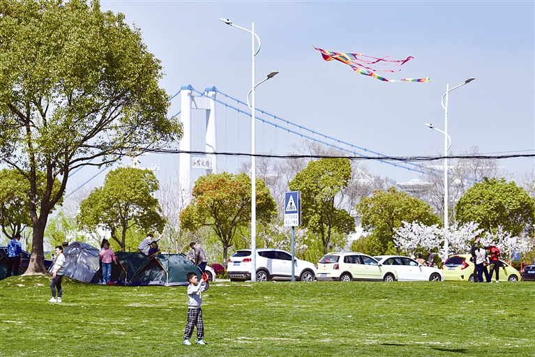 春风和煦,万物复苏愈明媚。昨天下午,许多市民趁天气晴好,来到江阴外滩踏青,在草坪上搭帐篷、放风筝,尽享美好春光。(丁家骏 摄)