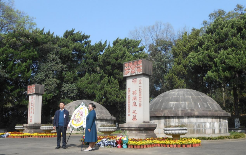 余飞(左)和董红(右)为革命先烈敬献花圈