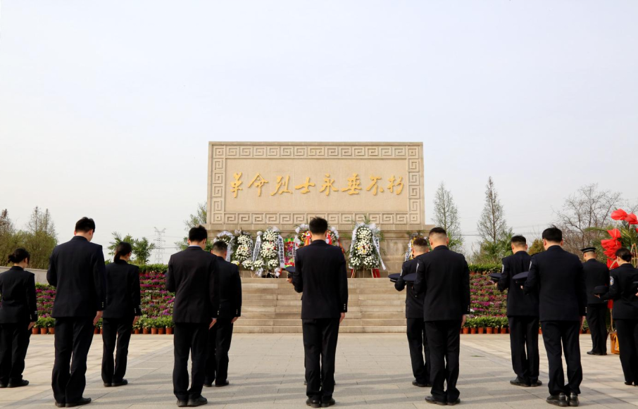 在弯腰沟红色教育基地,党员民警走过凯旋桥,穿过“不忘初心”牌坊,来到纪念区广场瞻仰烈士纪念碑,向烈士纪念碑敬献花篮,表达哀思,把最崇高的敬意献给长眠的烈士。