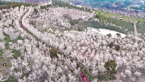 图为日前,位于陶都路的樱花岭迎来盛花期,吸引了不少市民踏青赏樱。