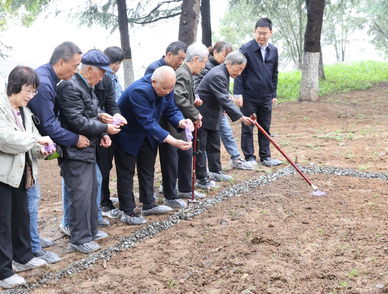 仪式结束后,全体人员移步至紫金草花园。在这里,象征着和平的紫金草正在盛开。大家和幸存者老人们一起,在播种田撒下紫金草花种,告慰逝者,祈愿和平。