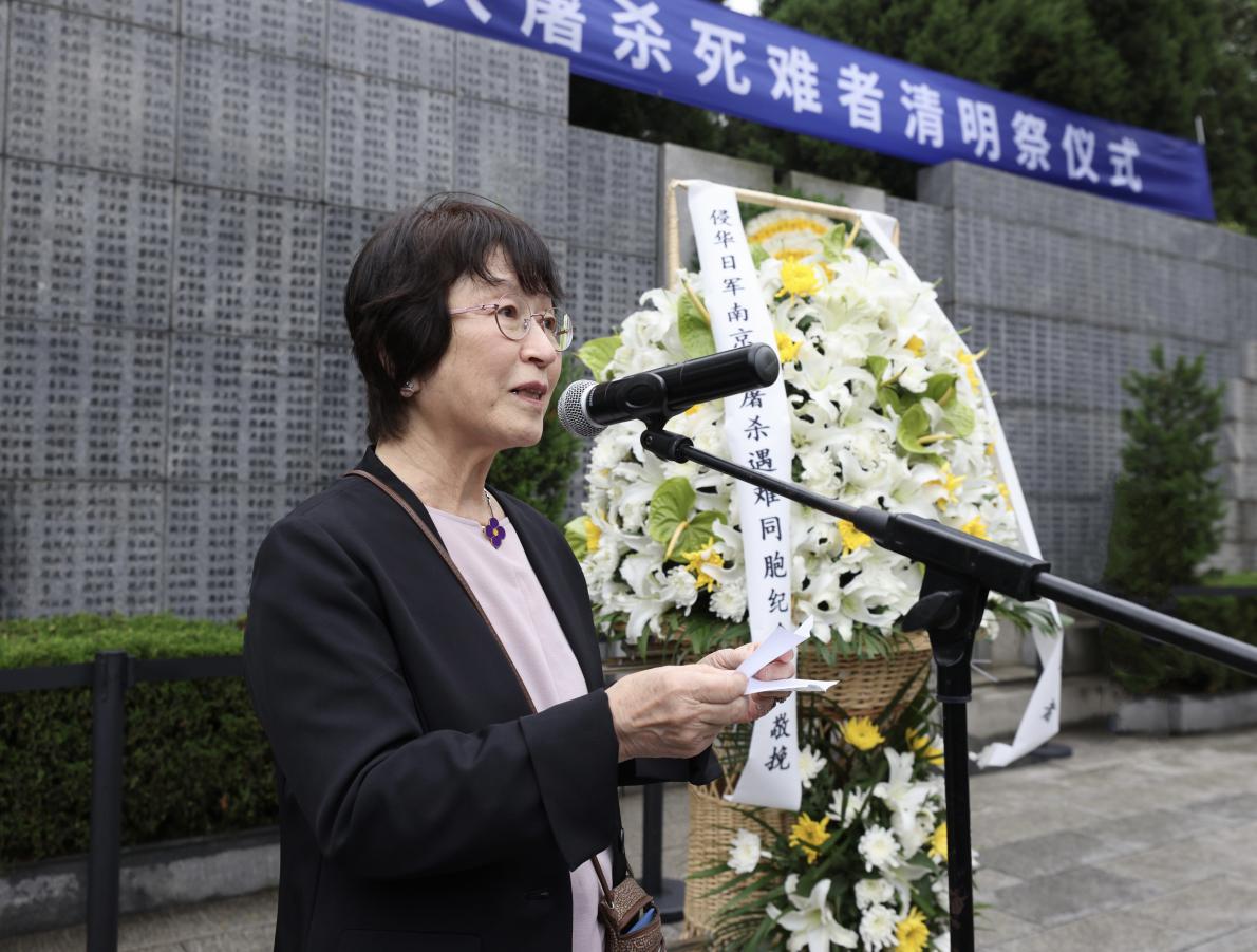 现场还出现了一位日本友人的身影,她就是日本“铭心会”会长松冈环。为了将南京大屠杀的历史真相与受害者们的痛苦遭遇告诉日本社会,自1988年以来,“铭心会”(南京)一直致力于开展有助于端正历史认知的活动。他们采访过进攻南京的日本老兵,调查过受害者的证言,制作了纪录片与书籍,并通过演讲会向日本社会普及正确的历史认知。松冈环表示:“此时的我心情非常沉重,因为我收到了太多南京大屠杀幸存者去世的噩耗。幸存者向世人讲述的悲惨经历,是在向现在敲响‘和平的警钟’。我们绝对不可以重复侵略战争与南京大屠杀的错误。”