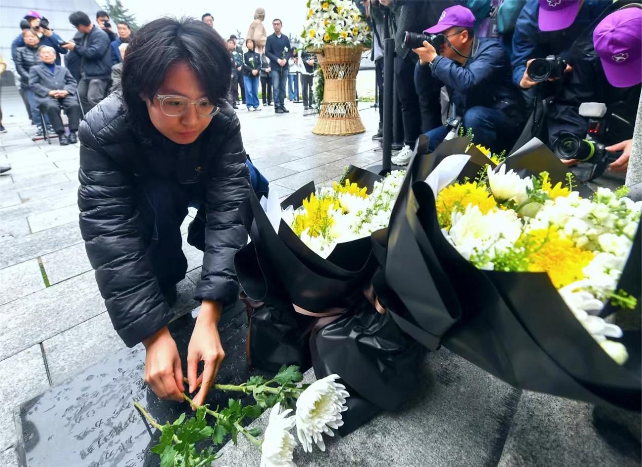 已故南京大屠杀幸存者马秀英的重孙女马雯倩敬献鲜花