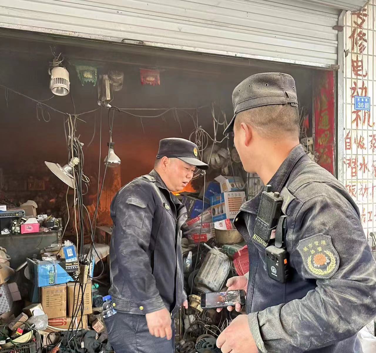 4月7日下午3点半左右,南通市通州区刘桥镇综合行政执法局的城管队员们正在辖区内开展常态化镇区巡查,组长汤胜楠发现对面路段突然冒出大量浓烟,立即过去查看,发现是修电机水泵的商铺突发火灾。听说火灾现场可能存在易燃易爆物品,如火情不加以控制,后果不堪设想。情况十分紧急,通州城管队员立即拨打了消防电话119,随即分工协作,汤胜楠和队员陈鲁均冲进去,顶着呛人的滚滚黑烟,冒着爆炸的危险,拿了灭火器对火点喷洒着灭火剂,后续更多城管队员赶到现场疏散并劝离周边群众。经在场城管队员齐心协力,用了十几分钟把火扑灭,及时避免了火情的进一步扩大和人民安全财产的更大损失。