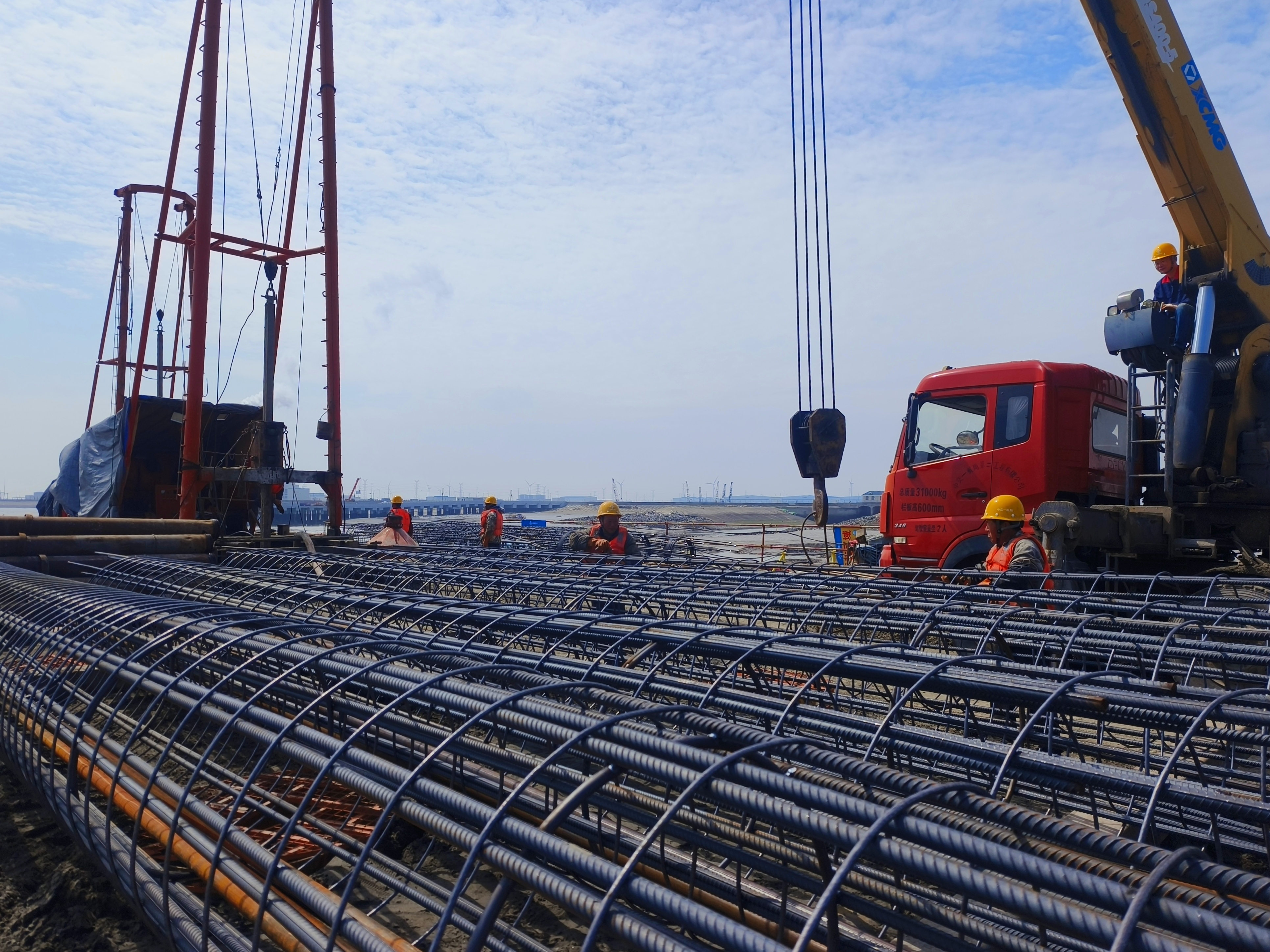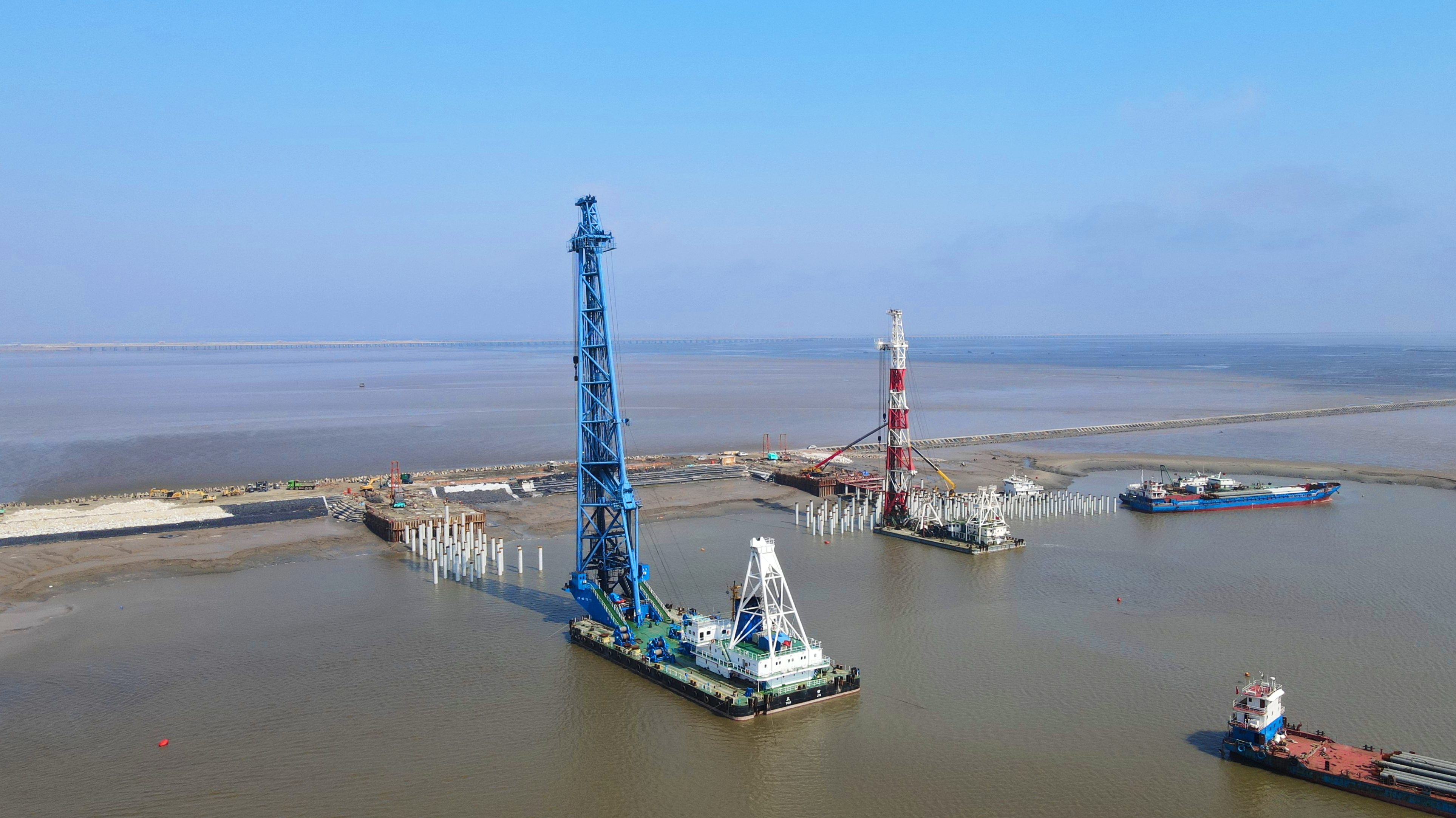 走进位于洋口港近岸浅滩海域的金牛码头项目区,两艘大型打桩船同时作业,20多艘小型配套船舶协同配合,现场人员、车辆来回穿梭,一派繁忙。“项目多点开展作业,我们现场投入了300多名施工人员,60多位管理人员,目前已完成了整体形象进度20%。”中交一航局金牛码头项目负责人随超越说。