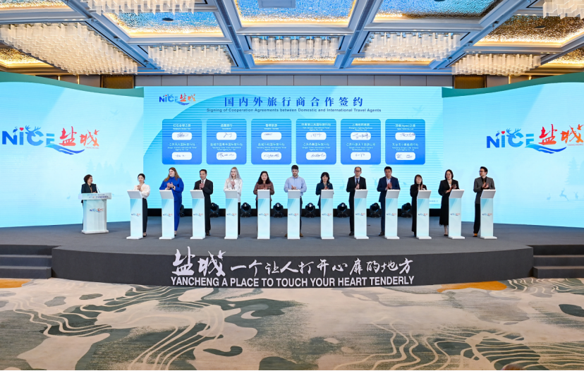 大会现场,播放了盐城城市形象片《NICE盐城》;市文化广电和旅游局、燕舞集团分别作推介;发布《水韵江苏国际化旅游场景新趋势》《畅游长三角》入境游产品线路、2024携程春季旅游趋势榜等;签订“燕展长空 携手同行”、城市宣传、城市文旅交流等合作协议;为5家境外旅行商合作伙伴授牌;集中签约36个文旅产业项目。