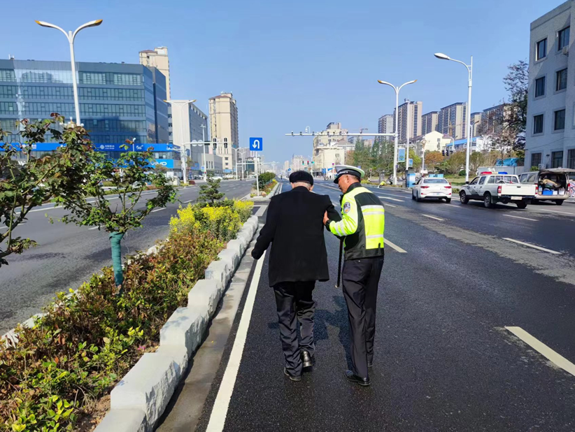 4月11日,有一位老人走在机动车道上,身边不时有车辆经过,情况非常危险,淮阴交警巡逻发现并安全带离。
