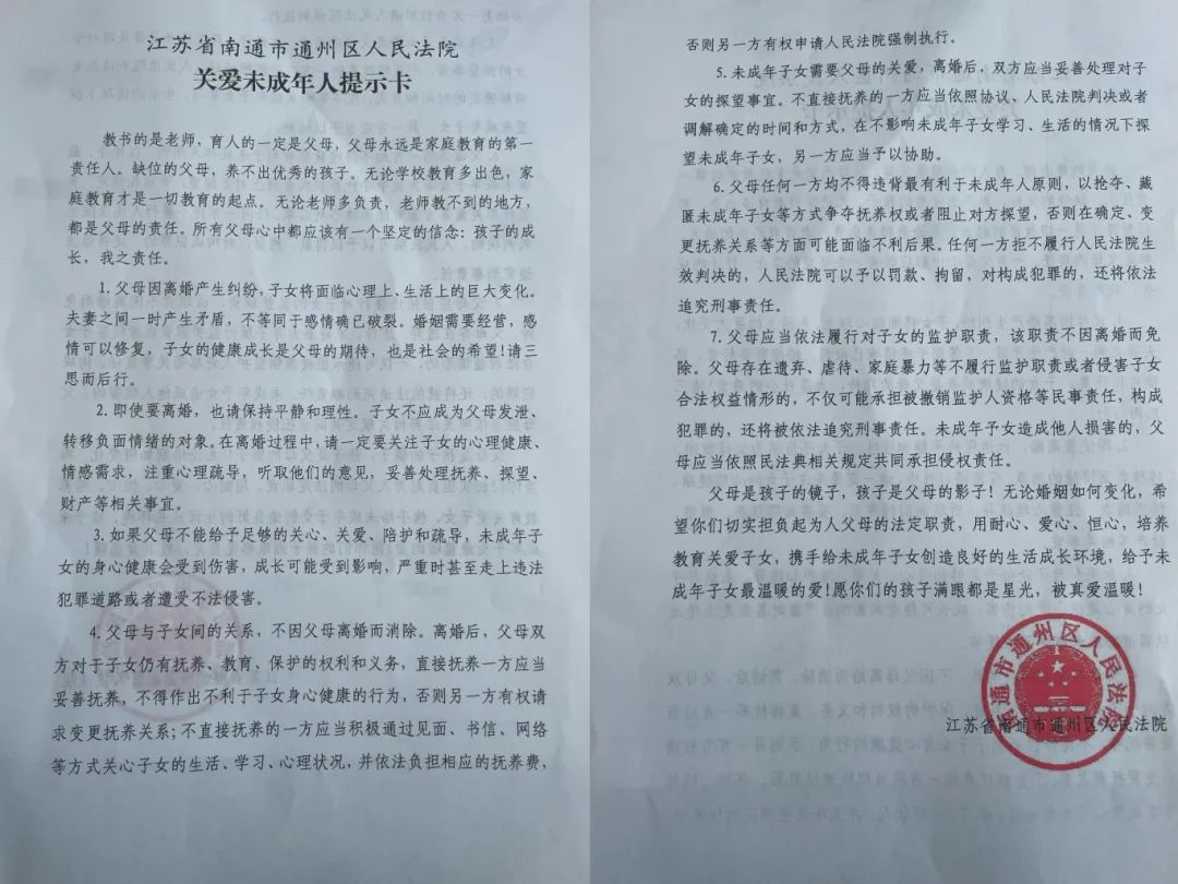 4月15日,最高人民法院发布《关于在涉及未成年子女的离婚案件中开展“关爱未成年人提示”工作的意见》。江苏省南通市通州区人民法院迅速贯彻落实,在《意见》发布当天,少年家事庭拟定《关爱未成年人提示卡》,并于4月16日离婚案件调解过程中向当事人送达。