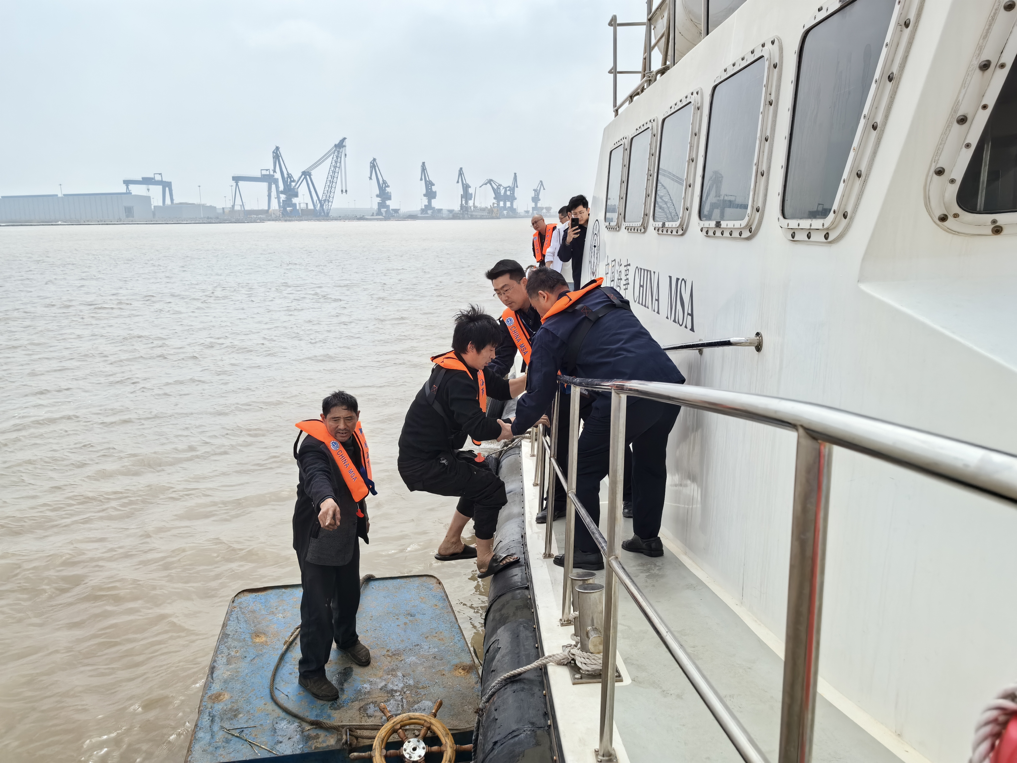 4月15日上午,连云港海事局执法人员在灌河水域巡航时发现一自制铁皮船上两人招手呼救,海巡艇立即减速靠近发现该船发动机故障失去动力,船舱内已有大量积水,随时有倾覆危险而且两人手机无信号无法与外界取得联系。因水流急和小船随流飘浮,海巡艇多次尝试后靠近小船,执法人员迅速抛投救生衣,利用长竿将两名船员转移到海巡艇,两人顺利脱险。