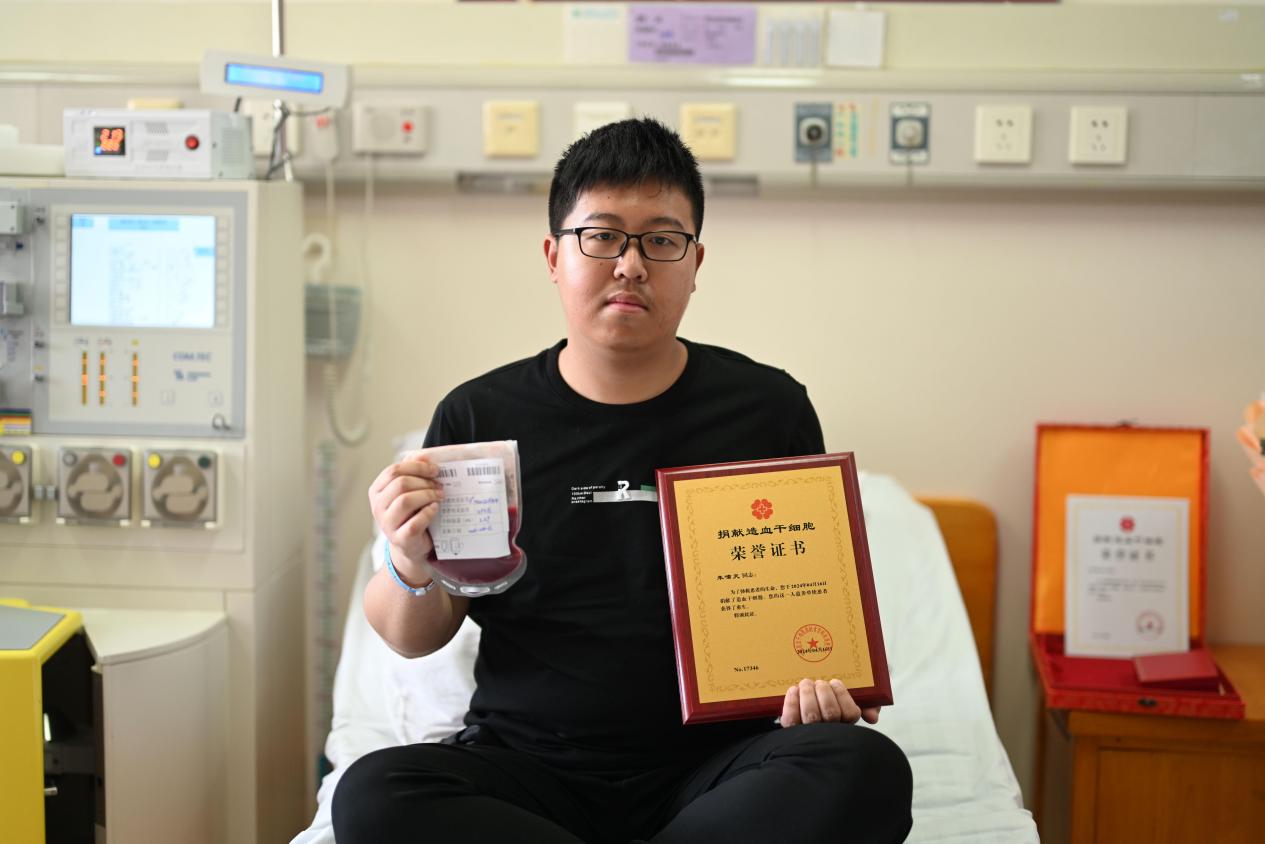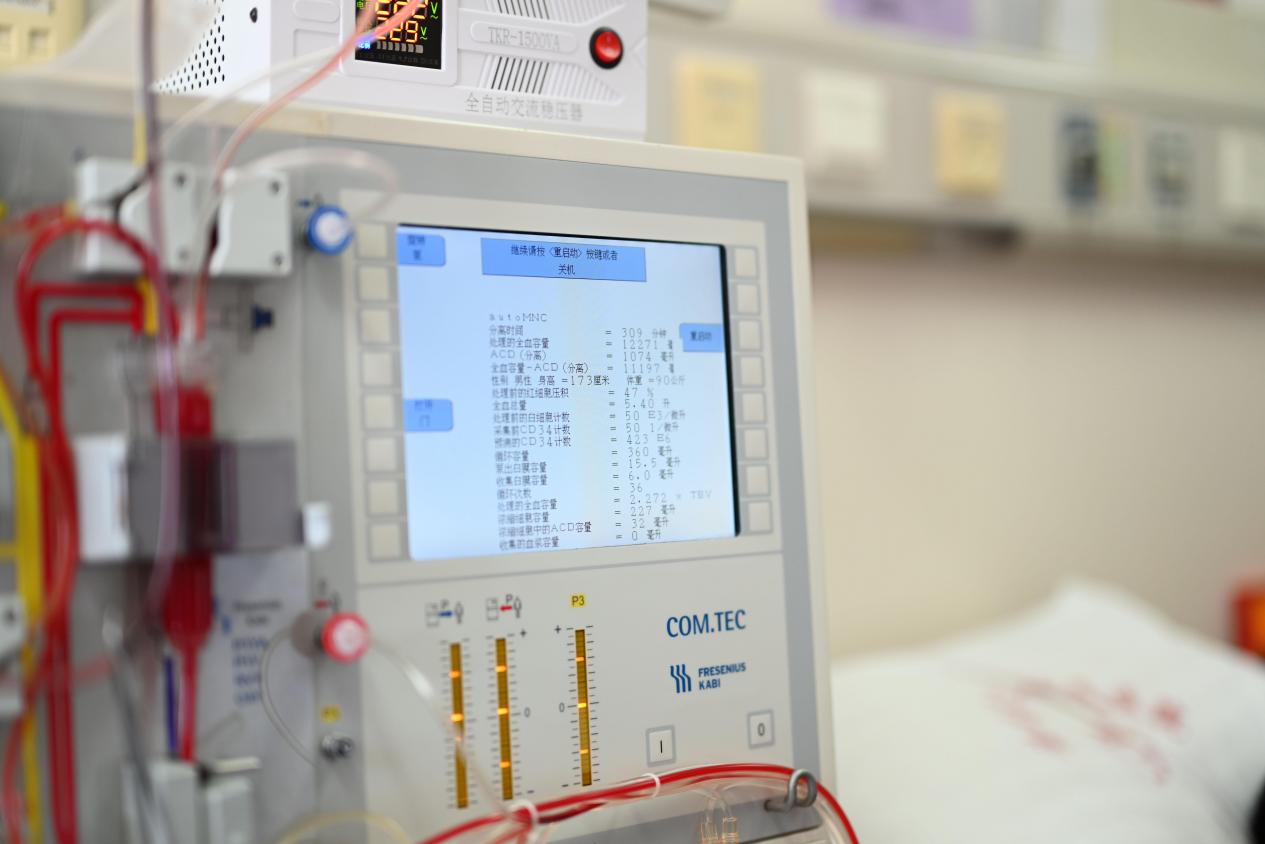 隔天早上8时,血液科一病区88号病房里这台承载着生命的希望的机器再次运转,“00后”律师朱啸天在此接受造血干细胞采集,大爱接力延续一名血液病患者的生命。