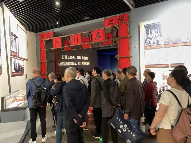党员们在讲解员的带领下参观了渡江胜利纪念馆主场馆。大家观看着馆内陈列着的历史照片和文物,重温渡江战役历史,感受先辈们不怕艰苦、斗争到底的精神和天翻地覆慨而慷的壮志豪情。