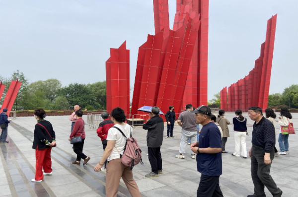 党员们从纪念馆出来后,眼前便是渡江胜利广场,它的中心矗立着一座雄伟的“千帆竞渡”群雕。党员们在群雕下追忆着75年前南京解放的伟大胜利。