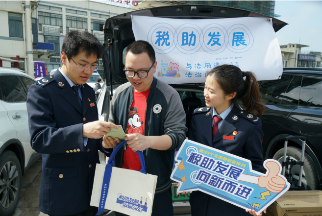 国家税务总局无锡市惠山区税务局将“税法直通车”开进“与法‘厢’遇 法治同心”后备箱集市,支起税费服务“小摊”,把就业创业税费支持政策、新办个体户操作流程等内容的宣传手册送到集市摊主手中。(吴奂)