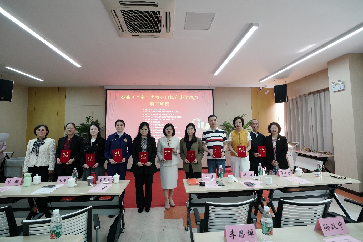 秦淮区委宣传部副部长、区文明办主任潘莹、秦淮区妇联副主席范海燕,一起为宣讲团成员发放聘书。