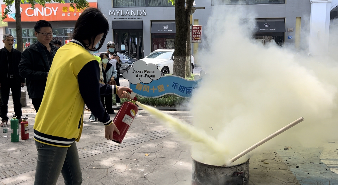 同时,演练还模拟了使用灭火器等应急处置环节,教会大家灭火器的使用口诀:提、拔、握、压,并现场模拟火情,让参与人员使用灭火器灭火。整个演练过程紧张有序,达到了预期效果。