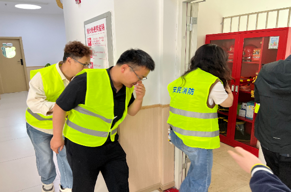 随着警报声响起,演练正式开始。模拟场景设定为星星家园中心的一楼突发火情,火势迅速蔓延。演练中,相关人员迅速行动,按照预先制定的疏散方案,捂住口鼻,低下身子,快速有序地通过安全通道撤离到指定安全区域。