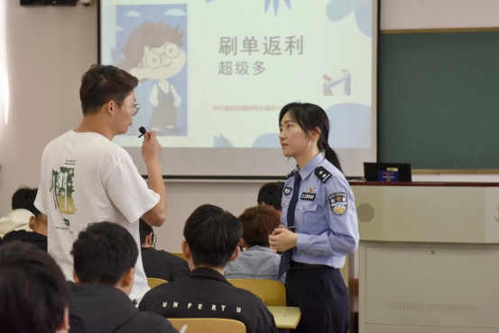 民警针对学生的特点,以身边真实的案例为切入口,给现场师生带来了精彩的反诈宣传讲座。讲座中,民警细致地讲解电信诈骗各类常见形式,着重讲解了与游戏类相关的骗局,如游戏账号、装备虚假交易诈骗,刷单兼职诈骗、刷单色情服务诈骗等各类诈骗形式。现场还设置了互动问答环节,反响热烈,同学们积极参与其中。