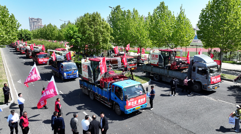 4月26日上午,江苏省农机跨区作业出征仪式在连云港市灌南县举行。出征仪式现场,由数百台服务保障车、油罐车、联合收割机等大型车辆组合成的车队,整齐地排列在绿树掩映下的柏油马路上,形成一条蔚为壮观的钢铁长龙,场面十分壮观。