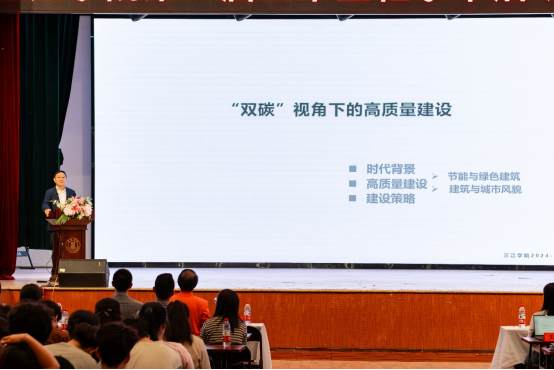 开幕式特邀江苏省建筑与历史文化研究会会长刘大威作了题为《双碳视角下的高质量建设》的主题报告,他从时代背景、必然选择、策略思考等方面分析了城乡建设绿色低碳发展的历史和现状,围绕高质量建设、建设策略、节能与绿色建筑、建筑与城市风貌等方面,带领在座的师生充分认识绿色低碳建设的时代性和必要性;并通过数据和案例相结合的方式介绍了江苏坚定不移贯彻创新、协调、绿色、开放、共享的新发展理念,从城市、街区、住区、建筑等层面提出了“科学决策、设计主导、被动优先、和谐共生”的高品质绿色低碳建筑的建设策略。整场讲座内容丰富、紧贴实际、实用性强,具体翔实的案例和生动语言引发了在场师生的共鸣,大家一致表示将充分吸收好、消化好讲座内容,积极运用到今后的科研和实践当中去。
