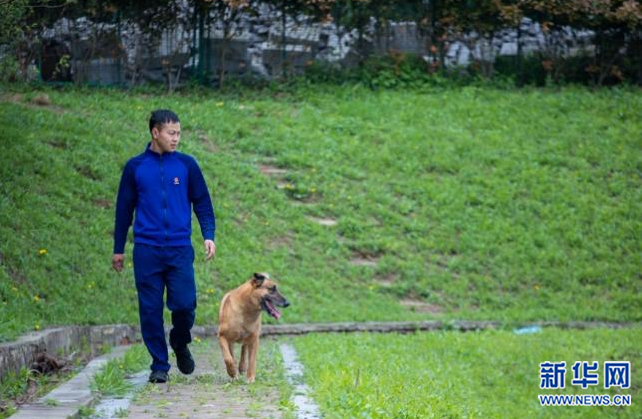 临近退休的大毛跟着训导员蒋龙伟在救援站散步