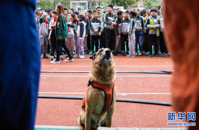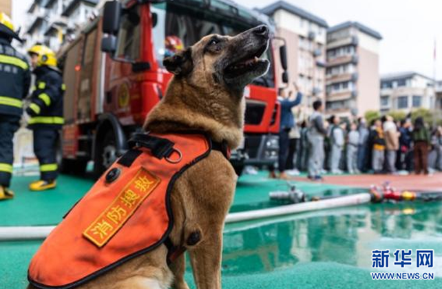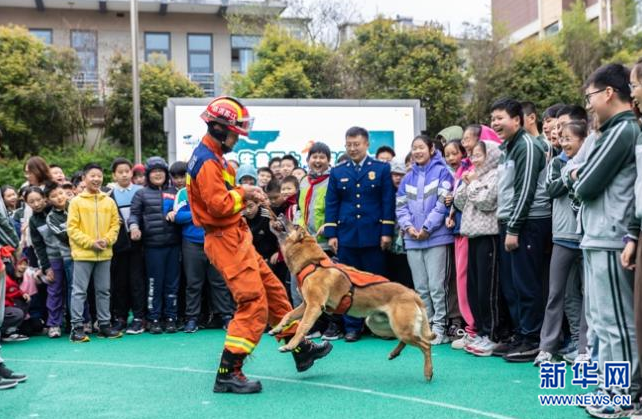 某小学校园安全宣传日活动上,大毛和训导员展示扑咬
