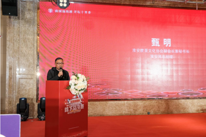 淮安掼蛋文化协会副会长兼秘书长、淮安网总经理甄明在致辞中表示,希望各位选手能在团结友爱、紧张有序的和睦氛围中完成比赛,赛出水平,赛出风格。希望汤沟酒业以后能多多举办“线上+线下”联动的掼蛋大赛,时时为大家提供一道道精美的“美酒+掼蛋”文化大餐,淮安掼蛋文化协会也愿为续写“南国汤沟酒 开坛十里香”的辉煌而共同努力。