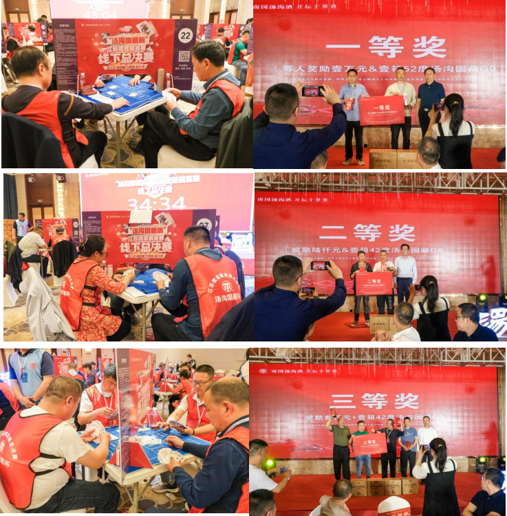 淮安掼蛋文化协会副会长(裁判长)杨海东宣读比赛规则,本次比赛采用2022年国家体育总局棋牌管理中心审定的《竞技掼蛋竞赛规则(试行)》及本次比赛相关补充规则,积分算法采用《淮安掼蛋文化协会积分赛规则》。活动现场,参赛者凭借自己丰富的比赛经验和专业的掼蛋技巧,与对手展开激烈角逐,经过4轮精彩博弈,决胜出一等奖(2名)、二等奖(2名)、三等奖(4名)、四等奖(12名)、五等奖(20名),赢得了丰厚的现金大奖和汤沟美酒。江苏省群众文化学会掼蛋文化研究院常务副院长顾祖根,汤沟酒业党委书记、董事长朱耀汇,汤沟酒业销售有限公司总经理王黎明分别为获奖者颁奖。