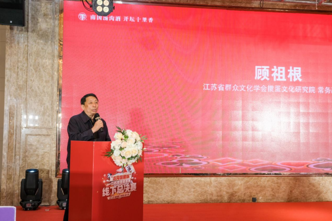 江苏省群众文化学会掼蛋文化研究院常务副院长顾祖根在致辞中表示,我们的宗旨和服务对象是站在文化的视角,研究掼蛋的起源、理论、魅力、创新的路径以及各种变化的趣味性、知识性、蕴含的理论性,将掼蛋娱乐上升到掼蛋文化,为掼蛋注入新的活力,为江苏文脉注入新的活力,为江苏文旅走进乡村、走进企业、走进社会增加新的动能。掼蛋事业的发展需要平台,掼蛋水平的提高需要平台,掼蛋经济的营造需要平台,汤沟酒业为我们搭建了一个很好的平台,为掼蛋选手提供一个温暖的家,祝愿各位掼蛋健将取得良好的成绩,祝愿汤沟酒业再创辉煌。