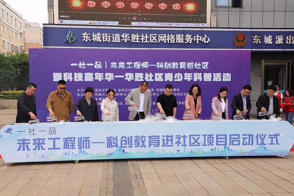 4月29日,常州市金坛区东城街道华胜社区德法文化广场举行“一社一品 未来工程师——科创教育进社区”启动仪式暨科技嘉年华青少年科普活动。金坛区民政局副局长张国强、区妇联副主席张婕、区科协副主席张国乾、东城街道党工委副书记朱丹俊及河海大学、东城实验小学师生代表共计百余人参加。